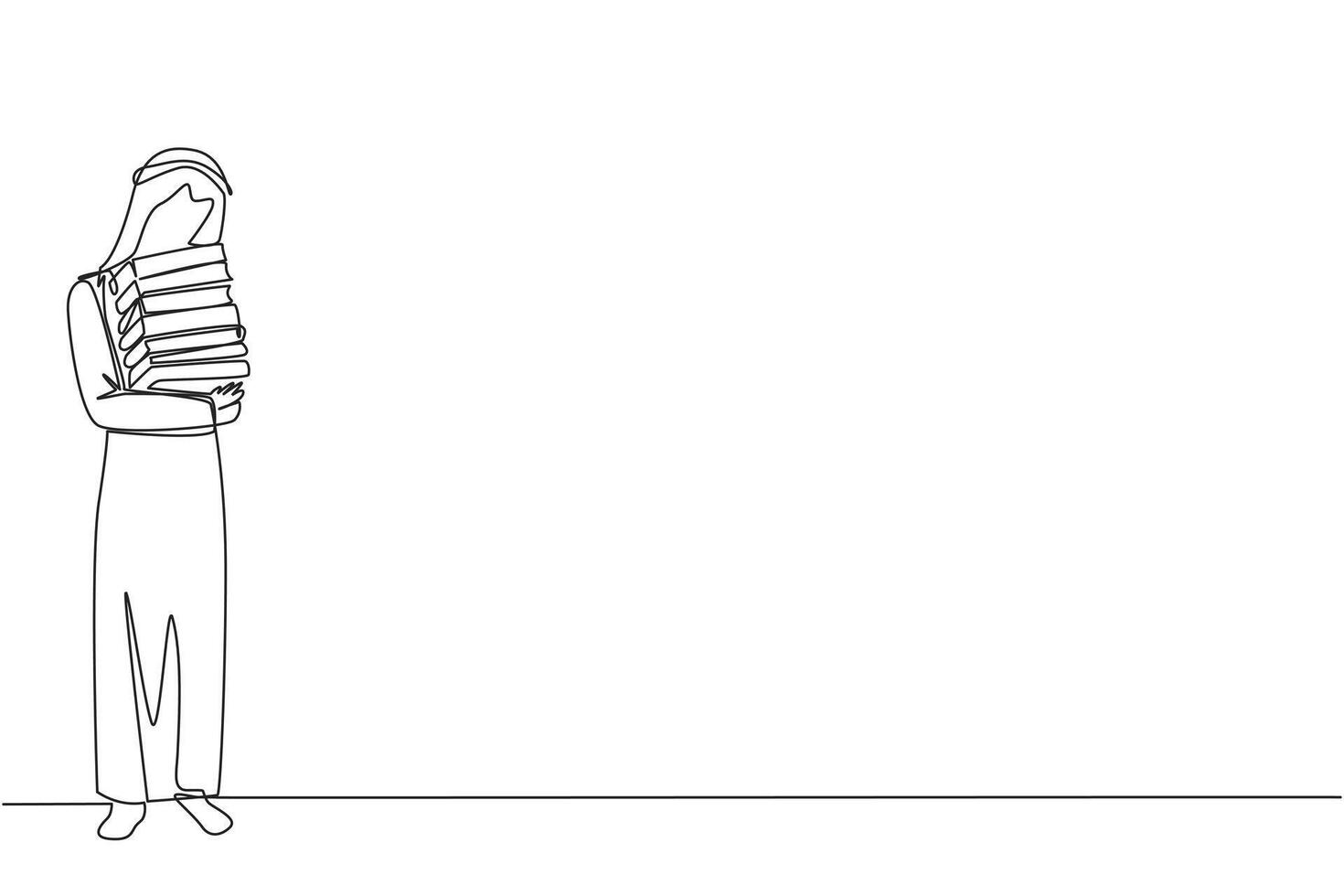 Continuous one line drawing Arab man standing hugging some books. Favorite book that finish reading. Some books will be donated to national library. Charity. Knowledge. Single line draw design Pro Vector