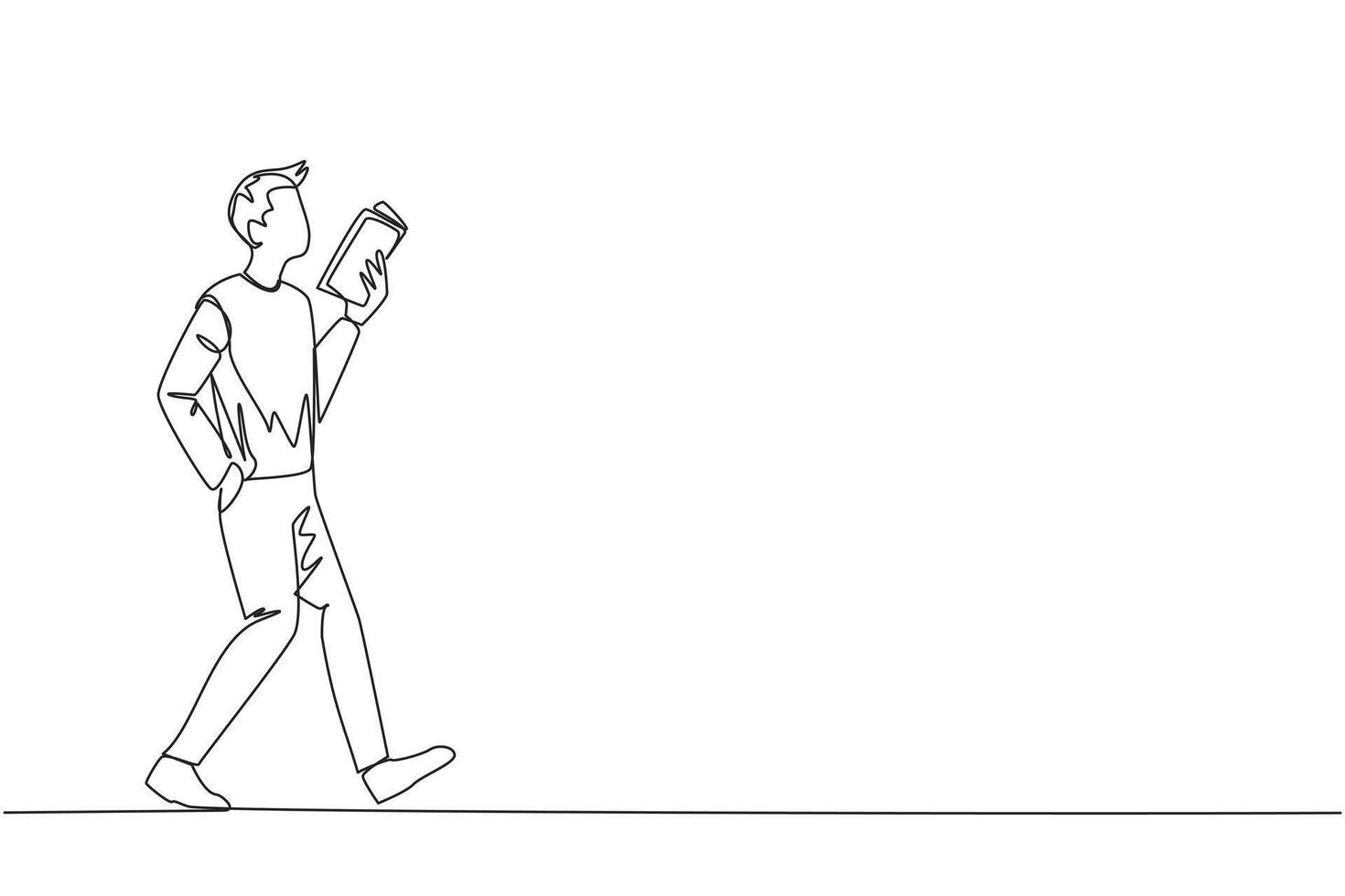Single continuous line drawing man walking while reading a book. The gesture of memorizing something from a book. Read anywhere. Addicted to reading. Book festival. One line design illustration Pro Vector