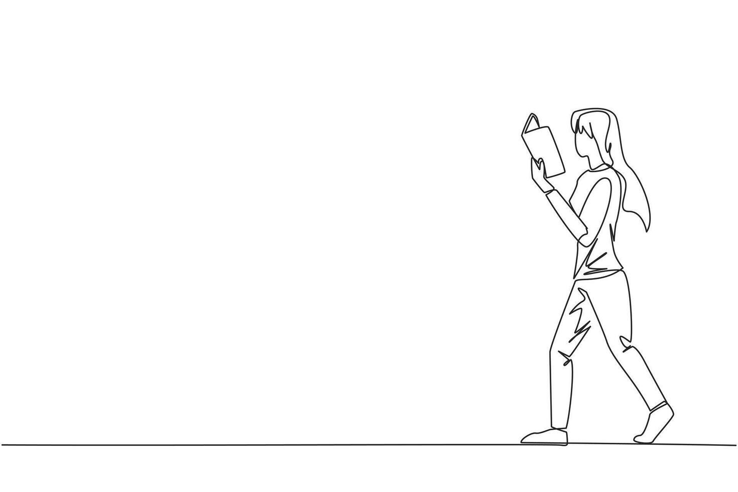 Single continuous line drawing woman walking while reading book. The gesture of memorizing something from a book. Read anywhere. Addicted to reading. Book festival. One line design illustration Pro Vector