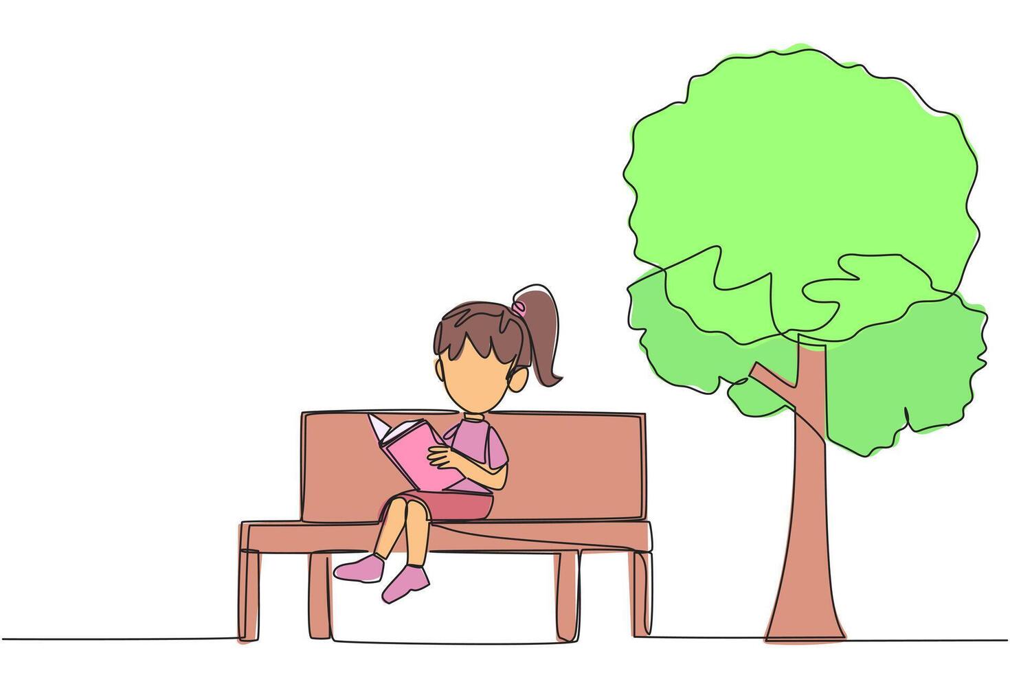 Single continuous line drawing girl sitting on school park bench reading book. Learn by re-reading textbook. Read to get maximum marks. Reading increase insight. One line design illustration Pro Vector
