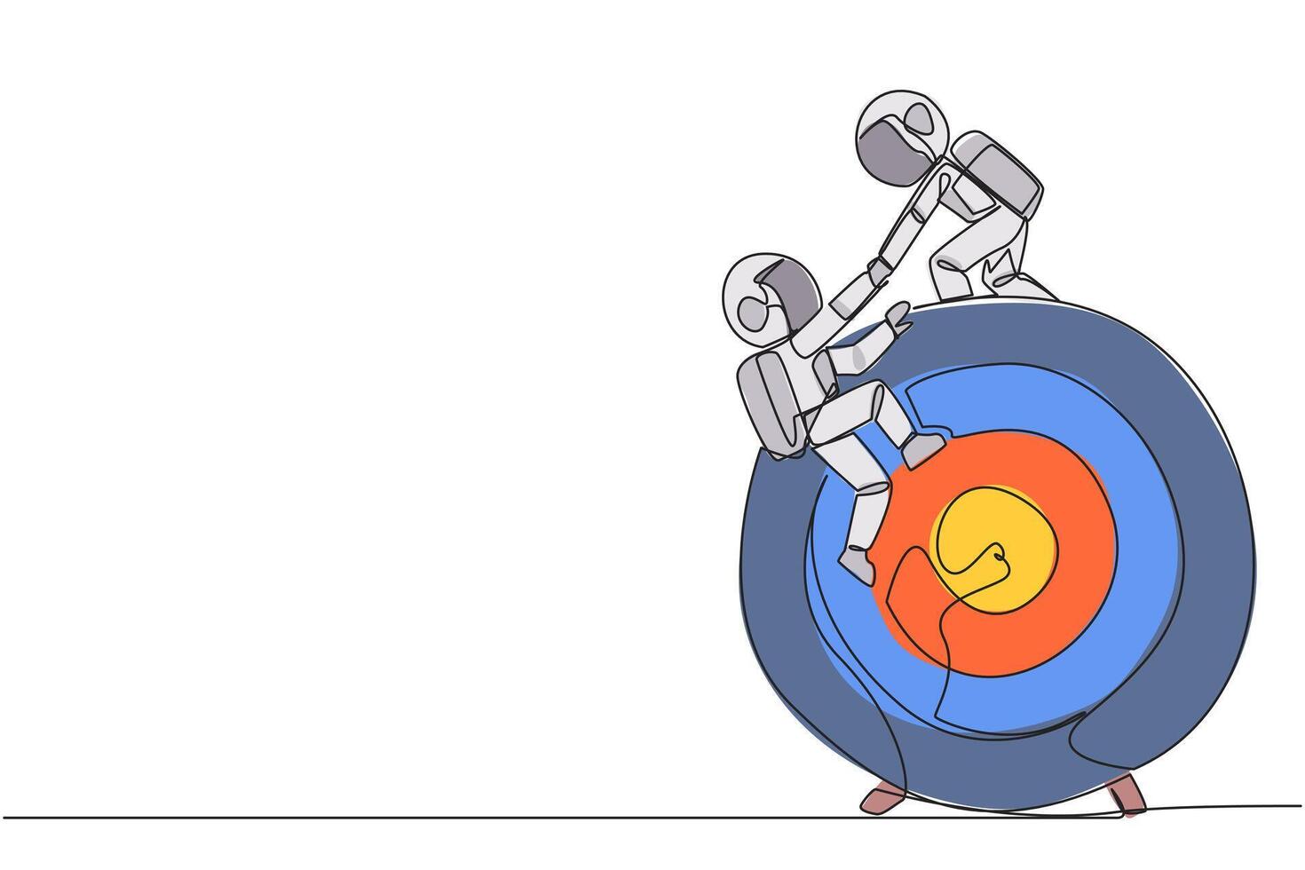 Single one line drawing young astronaut helps colleague climb the big arrow board target. Metaphors help focus on completing tasks one at time. Together. Continuous line design graphic illustration Pro Vector