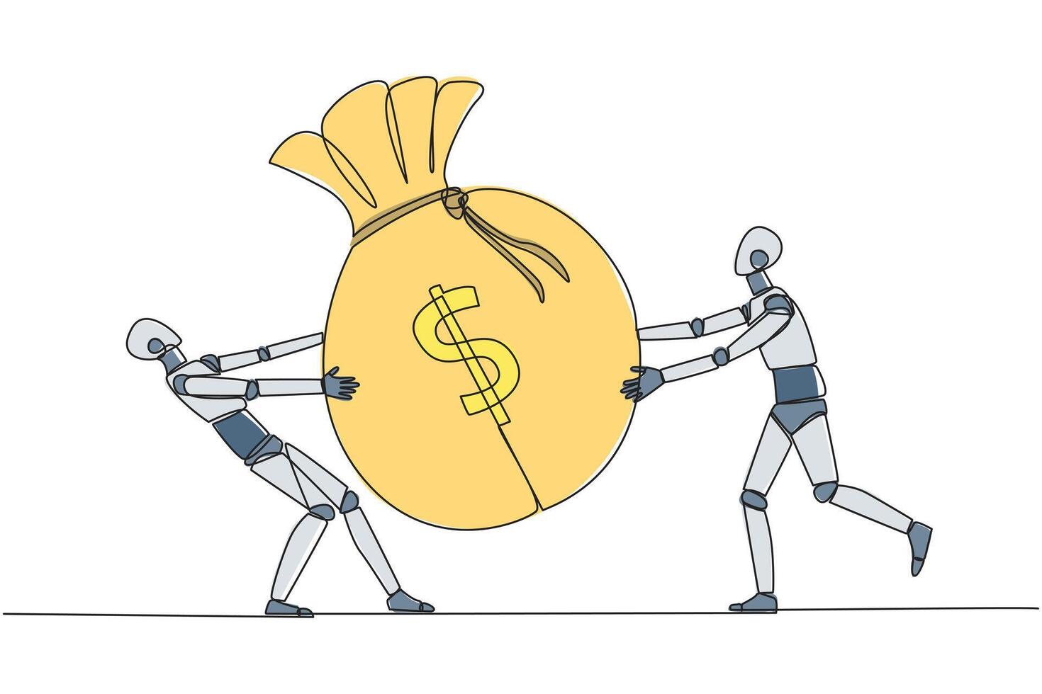 Single one line drawing two angry robot fighting over the big money bag. Fighting for additional capital after several shares were released to the public. Continuous line design graphic illustration Pro Vector