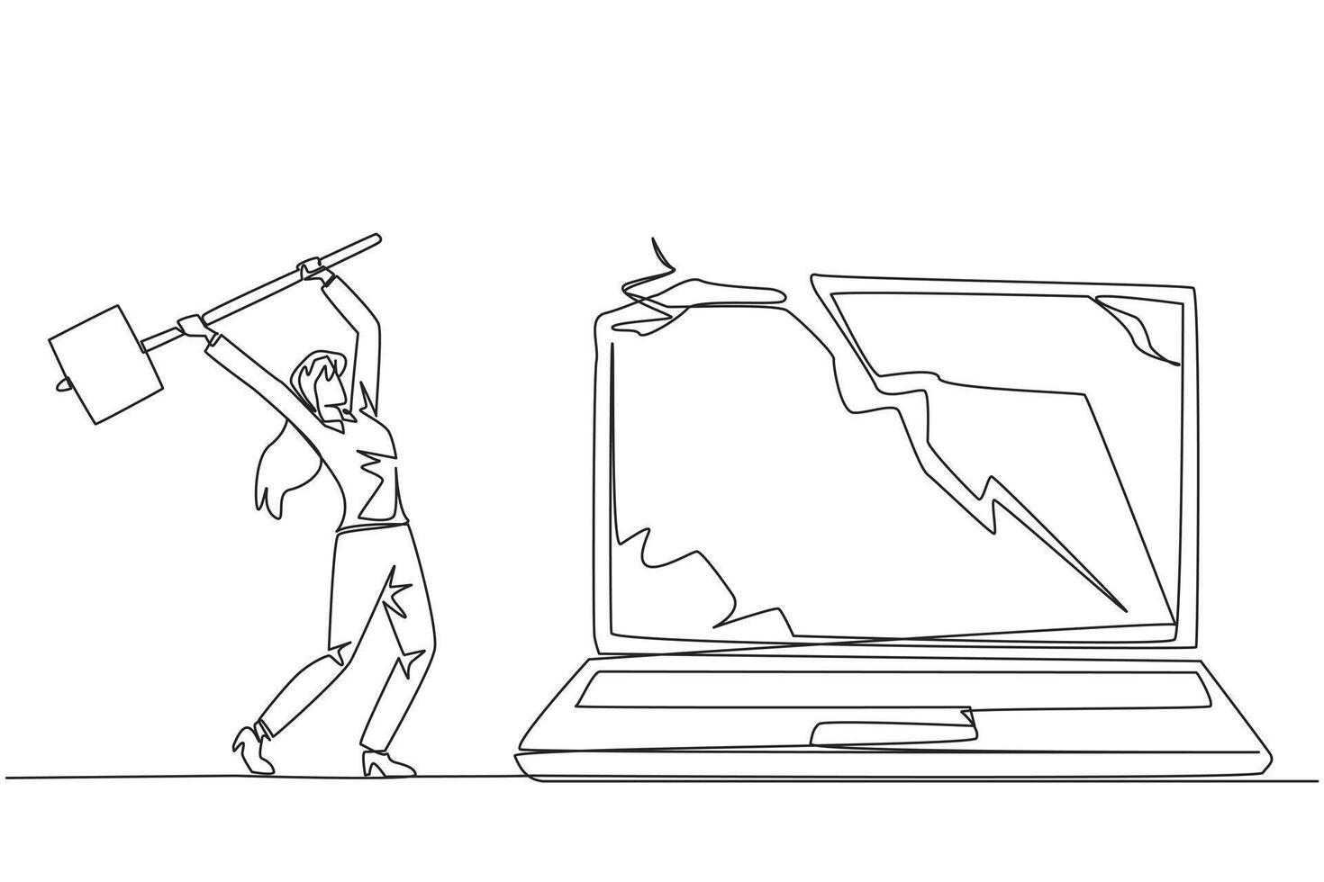 Single one line drawing businesswoman preparing to hit laptop. Rampage. Destroying technology that cannot be used optimally. Upgrade hardware and brainware. Continuous line design graphic illustration Pro Vector