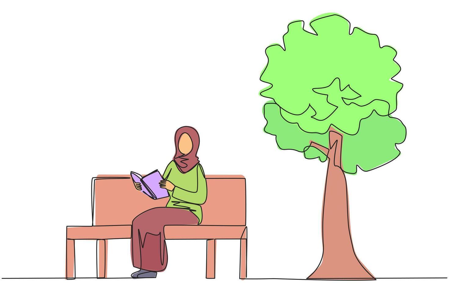 Single one line drawing Arabian woman sitting on park bench reading book. Learn by re-reading textbook. Read to get maximum marks. Reading increase insight. Continuous line design graphic illustration Pro Vector