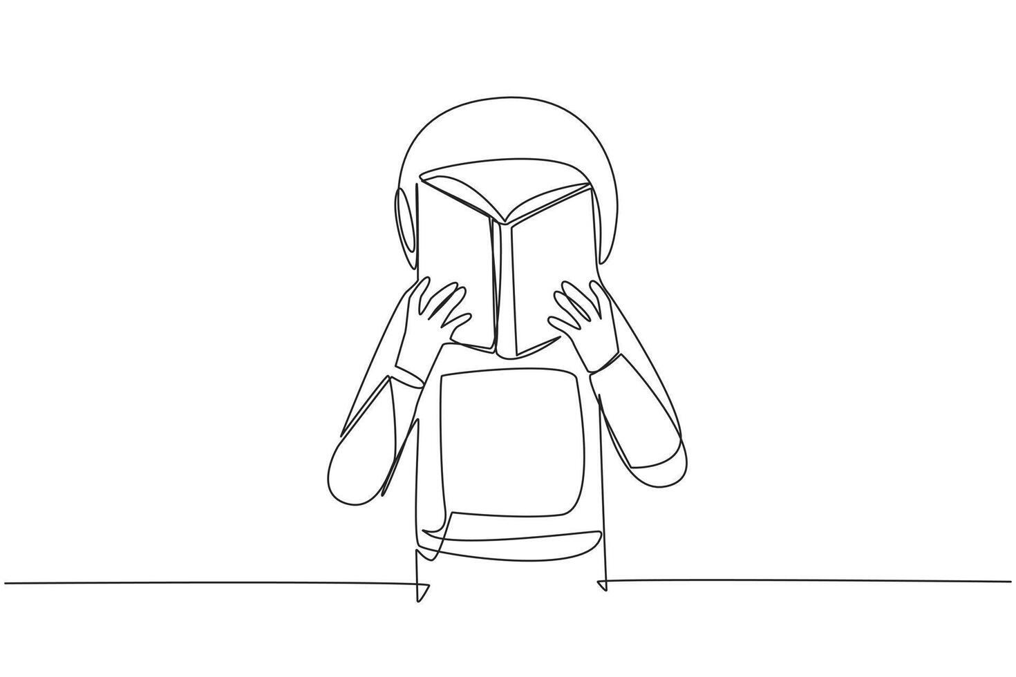 Single one line drawing astronaut seriously reading book until cover the face. Nervous when facing the final exams. Try to focus. Reading increase insight. Continuous line design graphic illustration Pro Vector