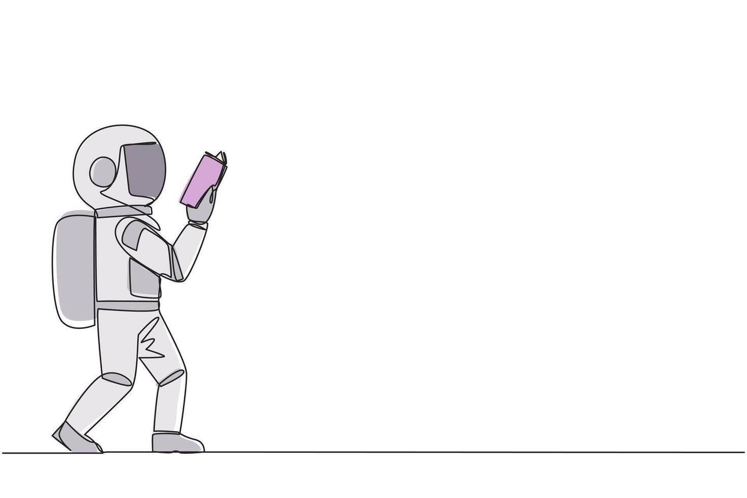 Single one line drawing astronaut walking reading the book. Gesture of memorizing something from a book. Read anywhere. Addicted to reading. Book festival. Continuous line design graphic illustration Pro Vector