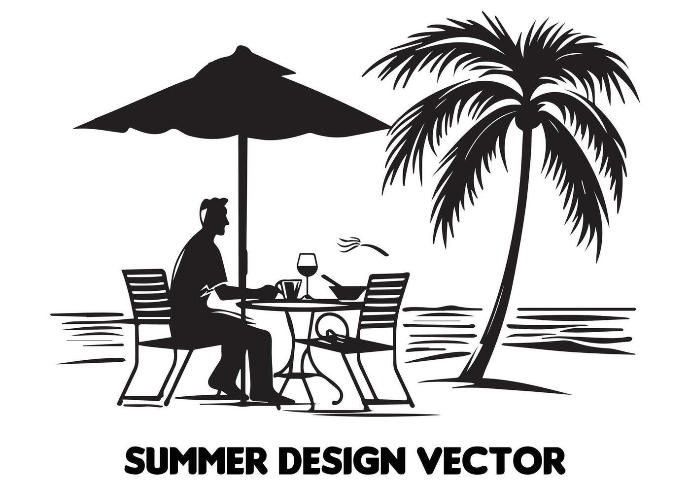 summer design palm tree sitting on chair front table and umbrella man beach for print on demand black bold simple outline free design vector