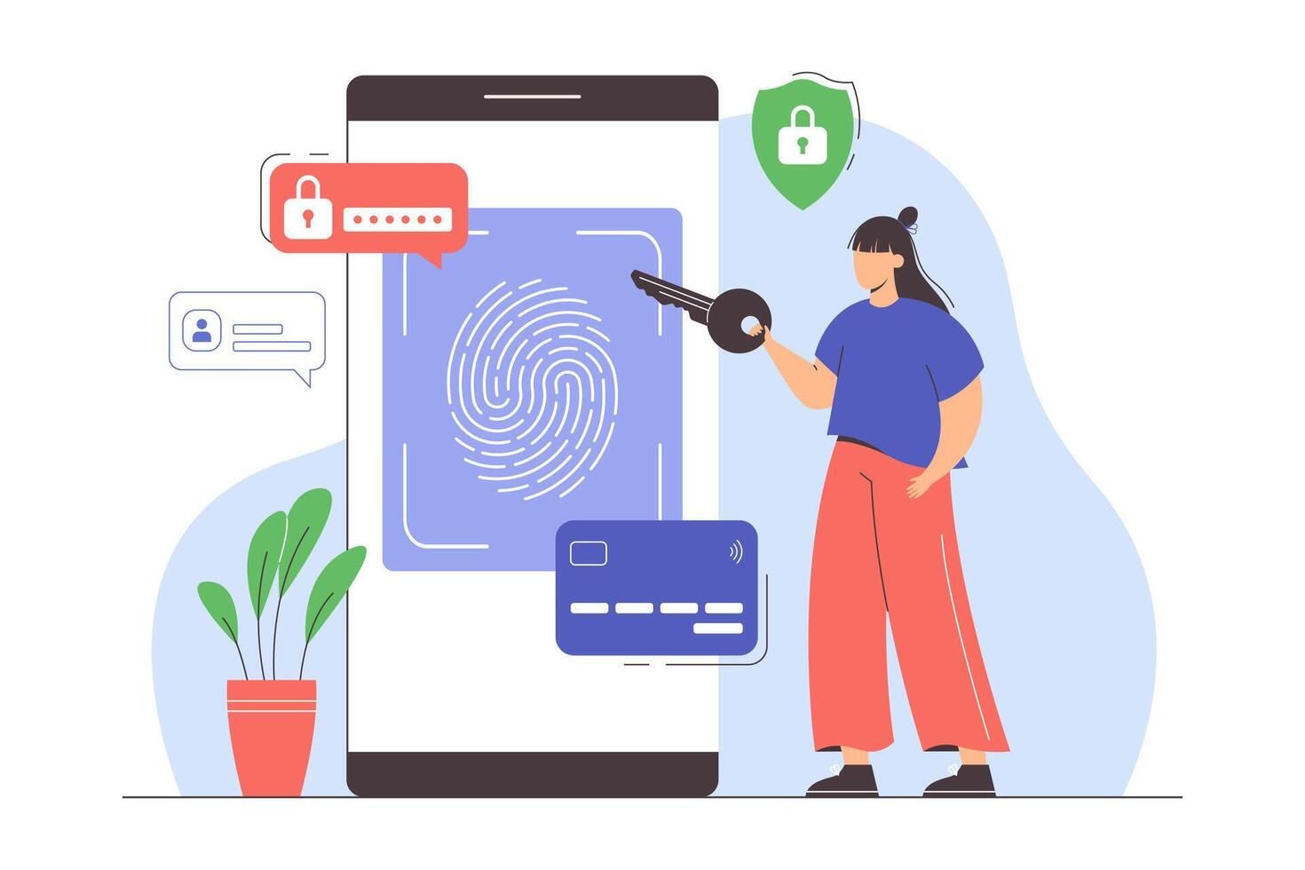Data protection with biometric identification. Fingerprint security system on smartphone for secure authentication and transactions. Flat woman provide key to access data. ID scanning technology. Pro Vector
