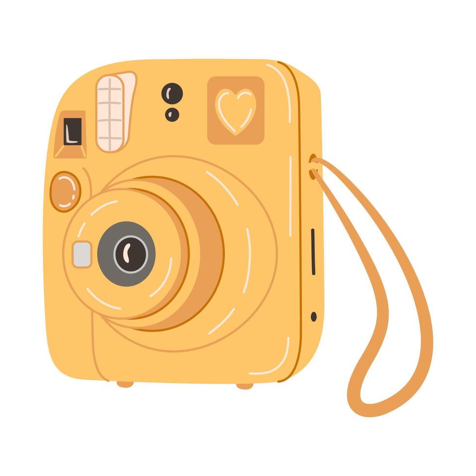 Yellow Instant camera device. Photography camera Hand drawn trendy flat style on white background. Icon for websites or mobile applications. Flash and lens visible. Pro Vector