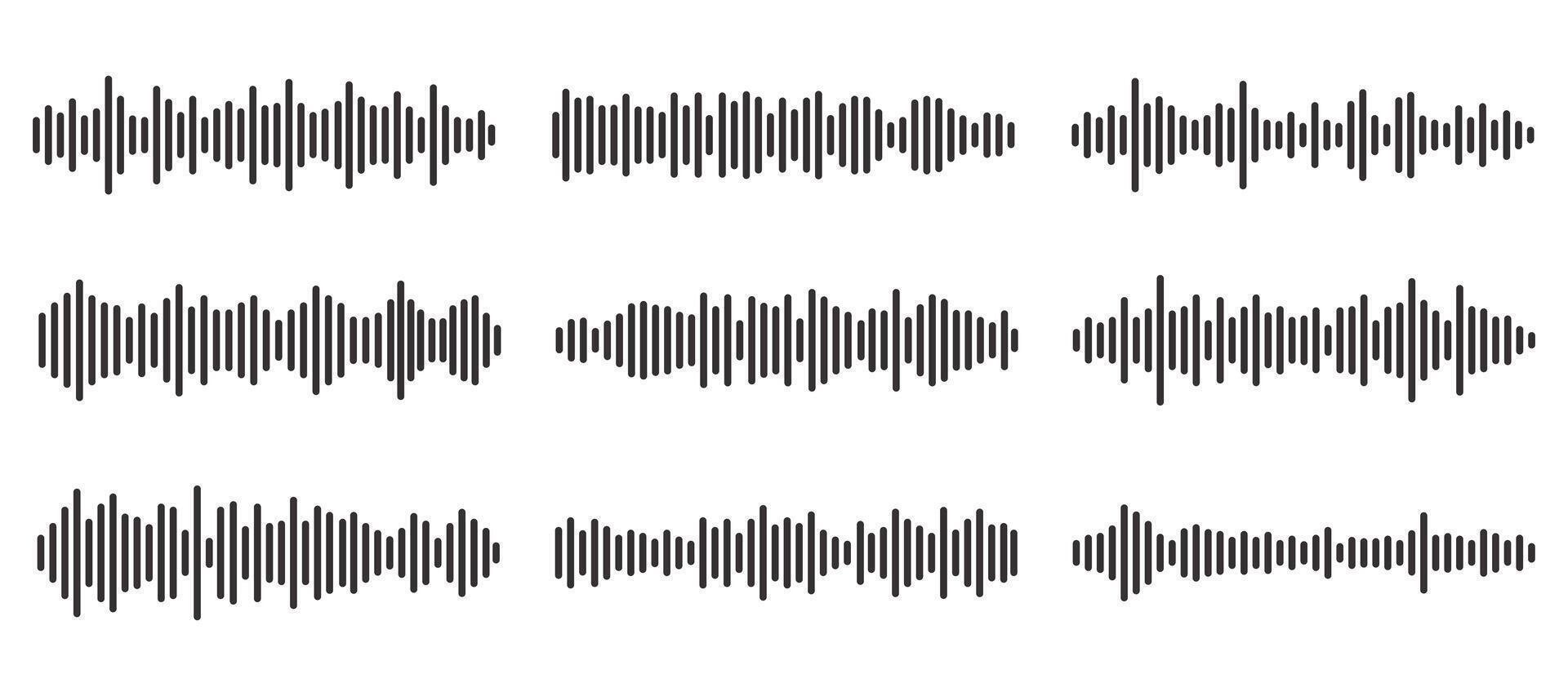 Set of wavy, vibrating and pulsating lines. Podcast sound waves. Waveform pattern for music player, podcast, voice message, music app. Audio wave icon. Isolated illustration. Pro Vector