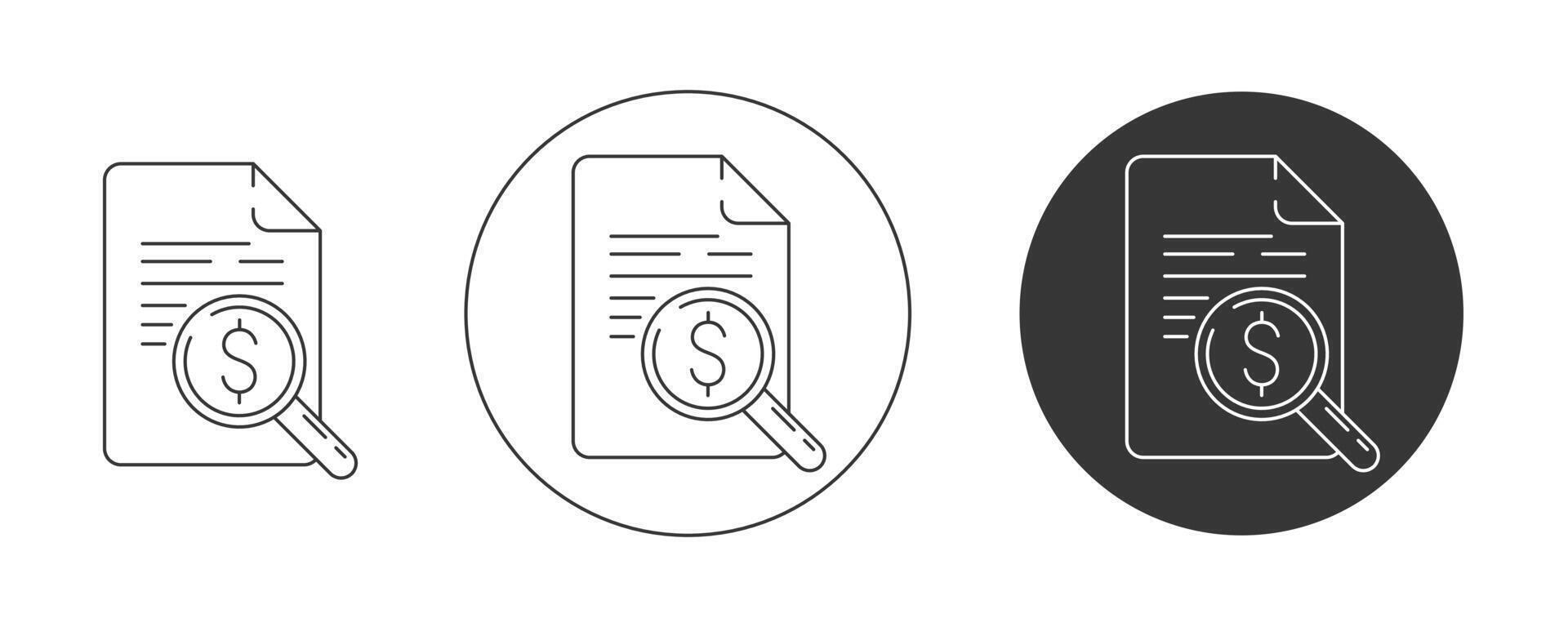 Paper with magnifying glass, dollar sign. Payment document, money report. icon set, editable stroke. Flat line, pictogram. Finance, business concept. For app, website, ui. Isolated background. Pro Vector