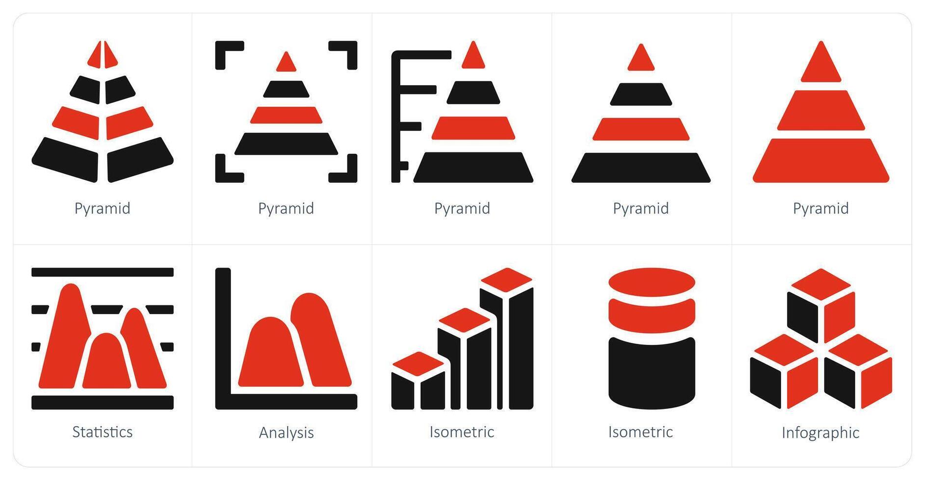 A set of 10 diagram and reports and Reports icons as pyramid, statistics, analysis Pro Vector