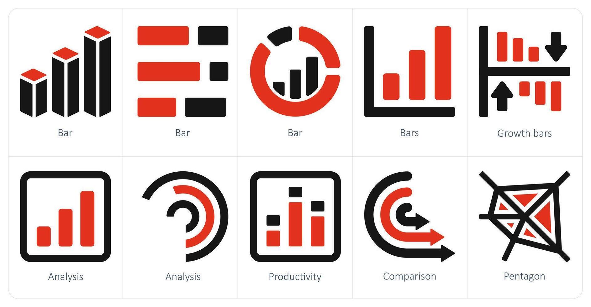A set of 10 diagram and reports and Reports icons as bar, growth bars, analysis Pro Vector