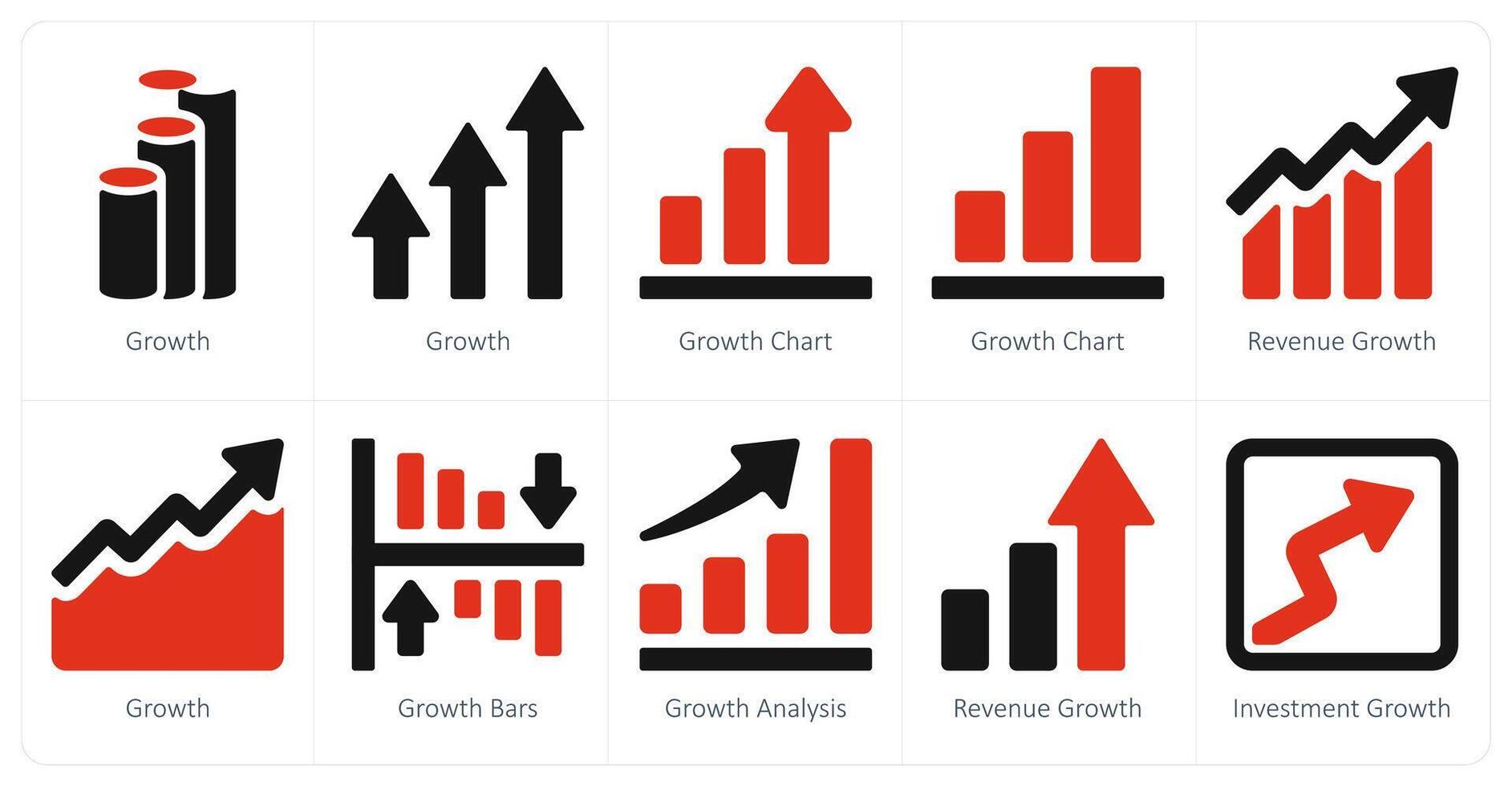 A set of 10 diagram and reports and Reports icons as growth, growth chart, revenue growth Pro Vector