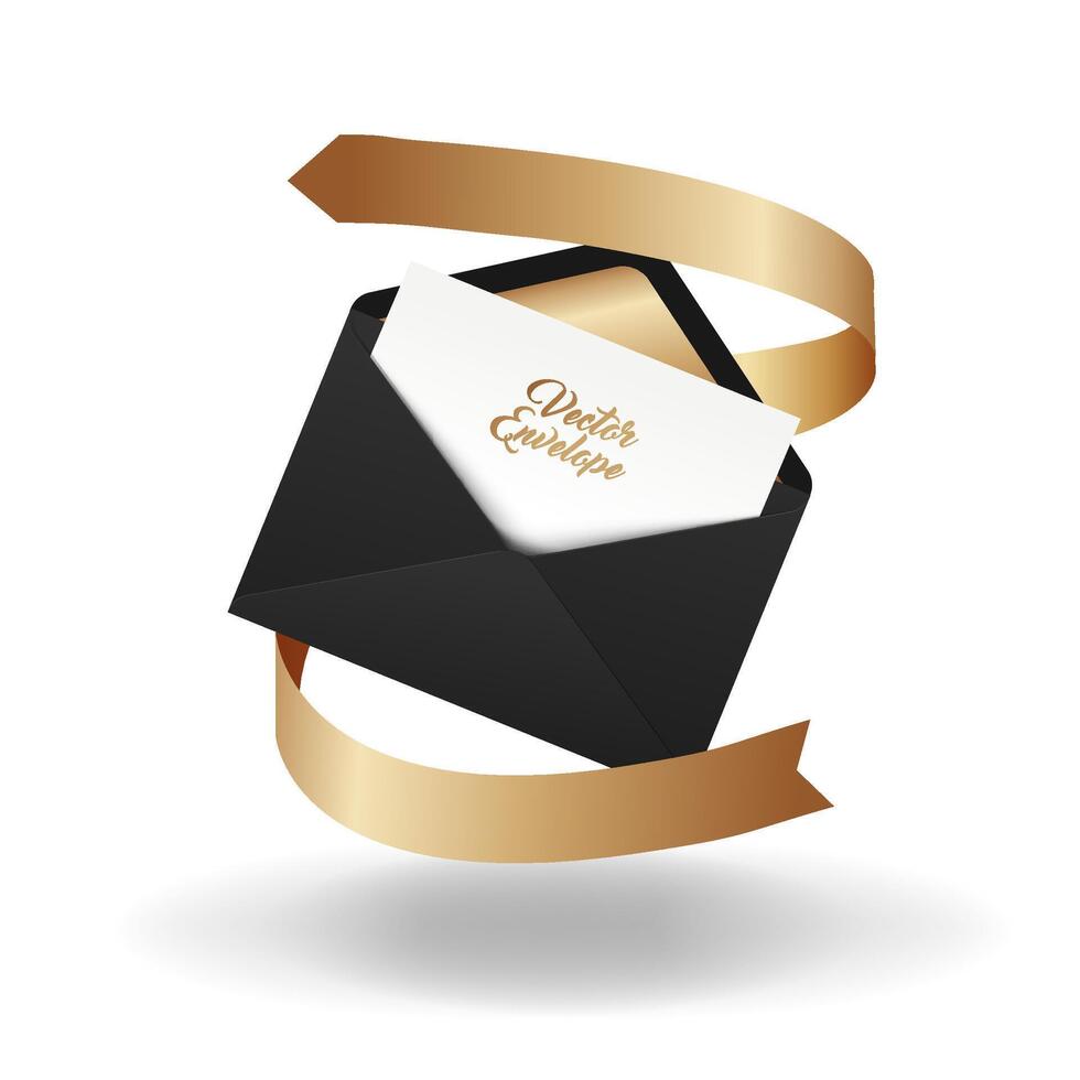 envelope. Open black envelope with invitation card and gold ribbon. Marriage invitation card design. Realistic backpack envelope. Pro Vector