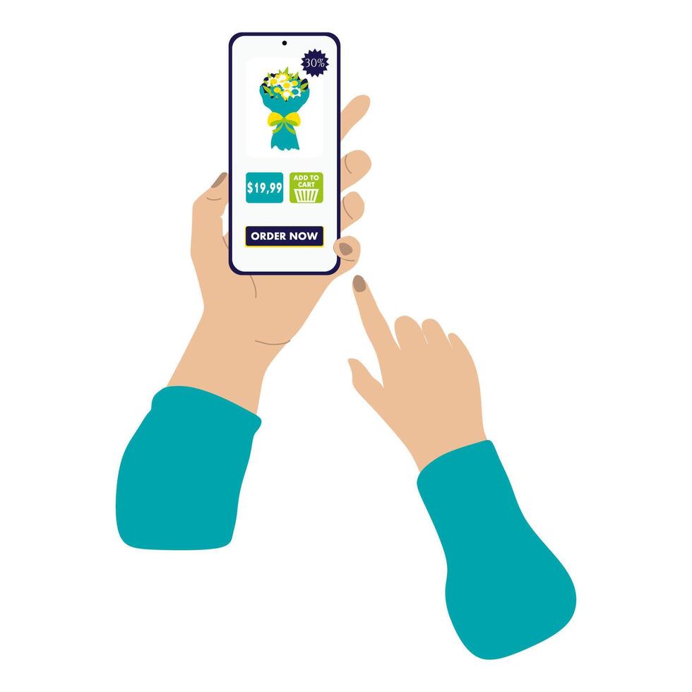 Hand holing Smart Phone with Buy Button on the screen. E-commerce flat design concept. Using mobile phone for online purchasing. Isolated illustration of Internet Shopping. Pro Vector