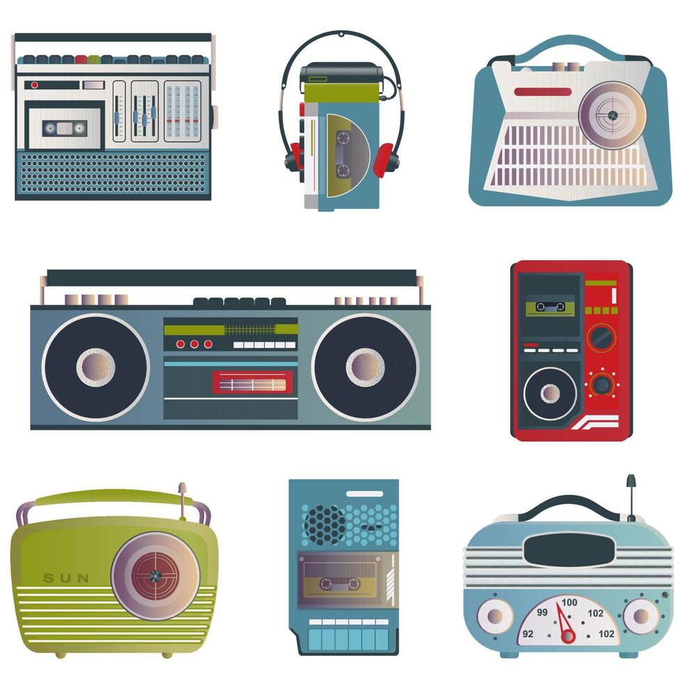 Retro media icons. Set of vector illustrations on the theme of retro music. Radio receivers, tape recorder, player, recorder in retro style. Pro Vector
