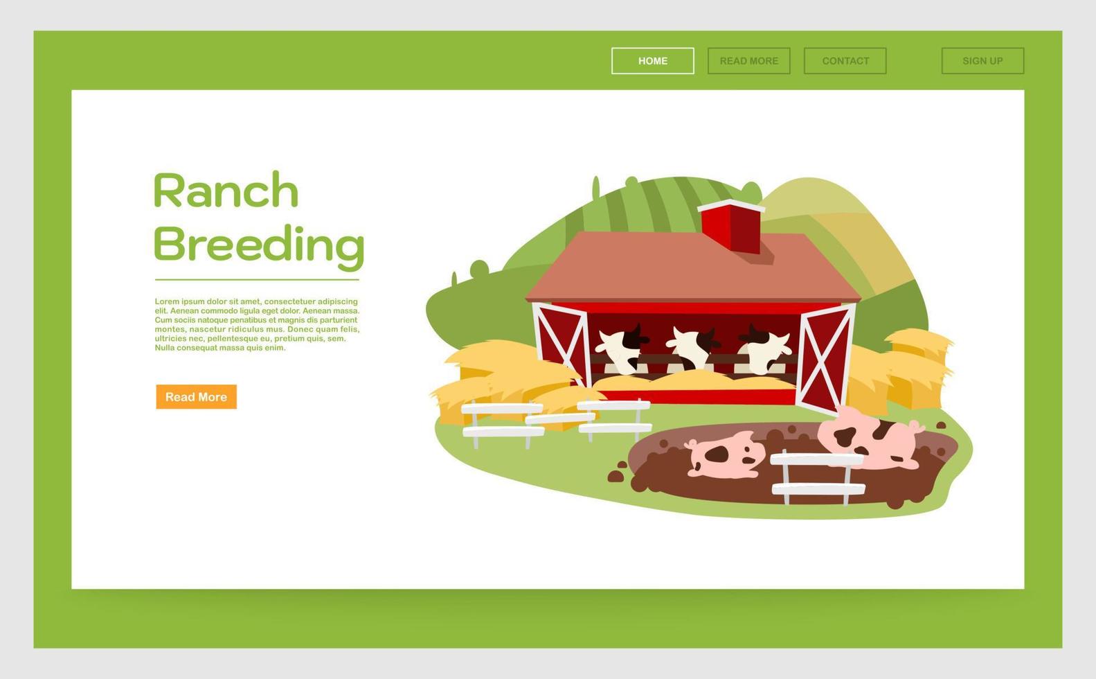 Ranch breeding landing page vector template. Livestock and cattle farming website interface idea with flat illustrations. Dairy farm, meat production homepage layout. Web banner, Pro Vector