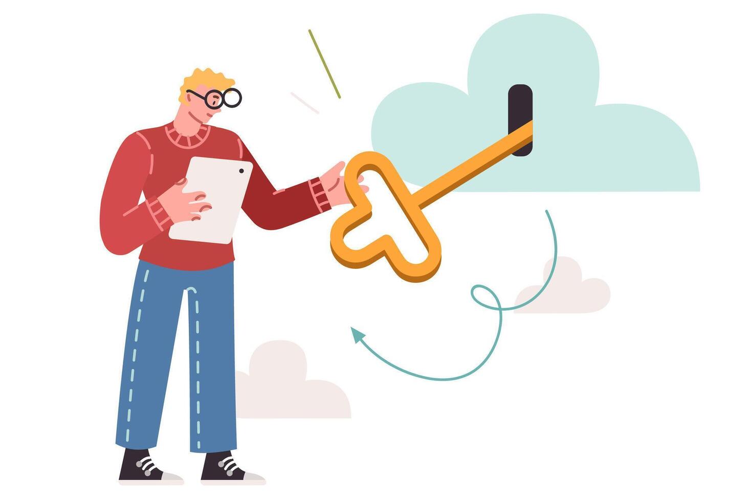 Man uses cloud technologies to store and process data, holds large key in hands to gain access Pro Vector