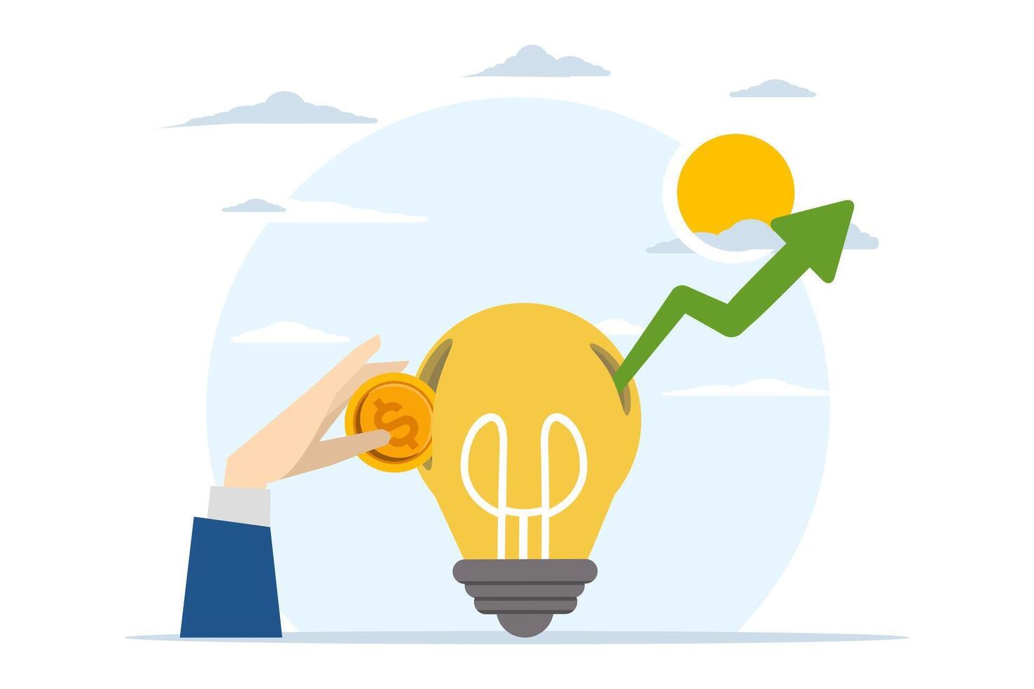 Concept of Investing in knowledge for more success, paying for additional learning and improving skills concept, Businessman hand inserting coin into light bulb while soaring graph. Pro Vector