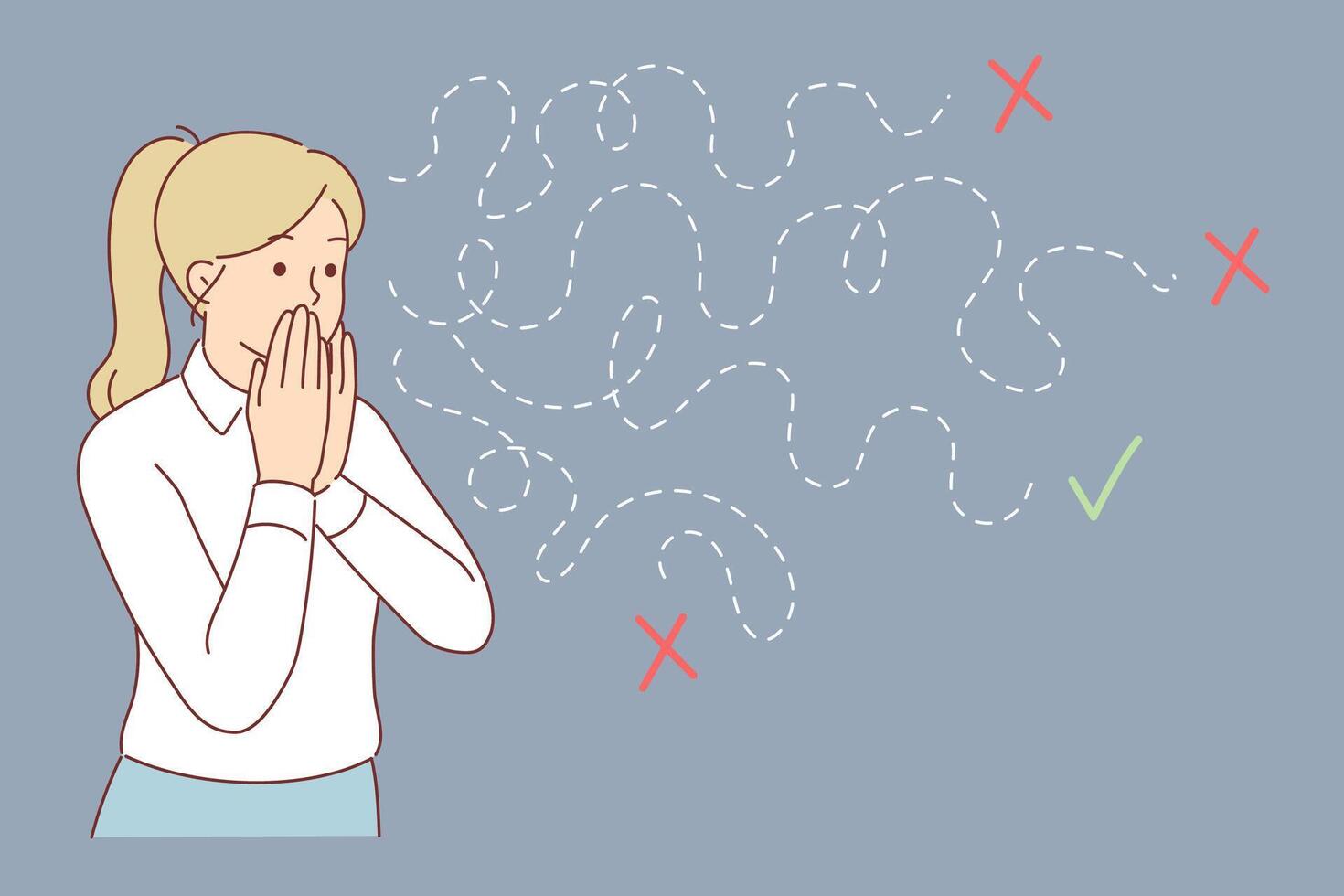 Woman makes difficult choice from several options, trying to make only right decision Pro Vector