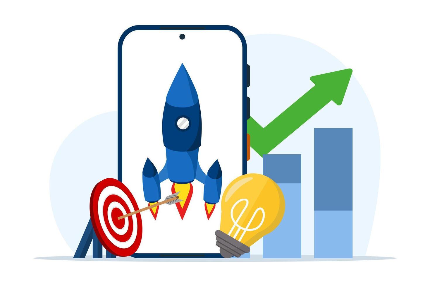 startup business concept and business targets. Teamwork in building a startup business. building a spaceship rocket, cohesive teamwork in initial . flat illustration on white background. Pro Vector