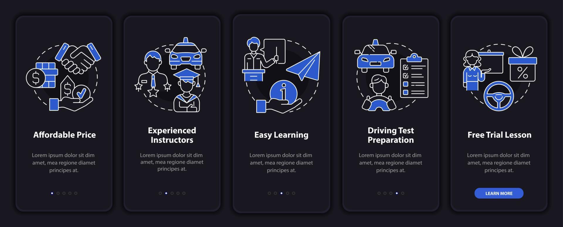 Driving school benefits dark onboarding mobile app page screen. Walkthrough 5 steps graphic instructions with concepts. UI, UX, GUI vector template with linear night mode illustrations Pro Vector