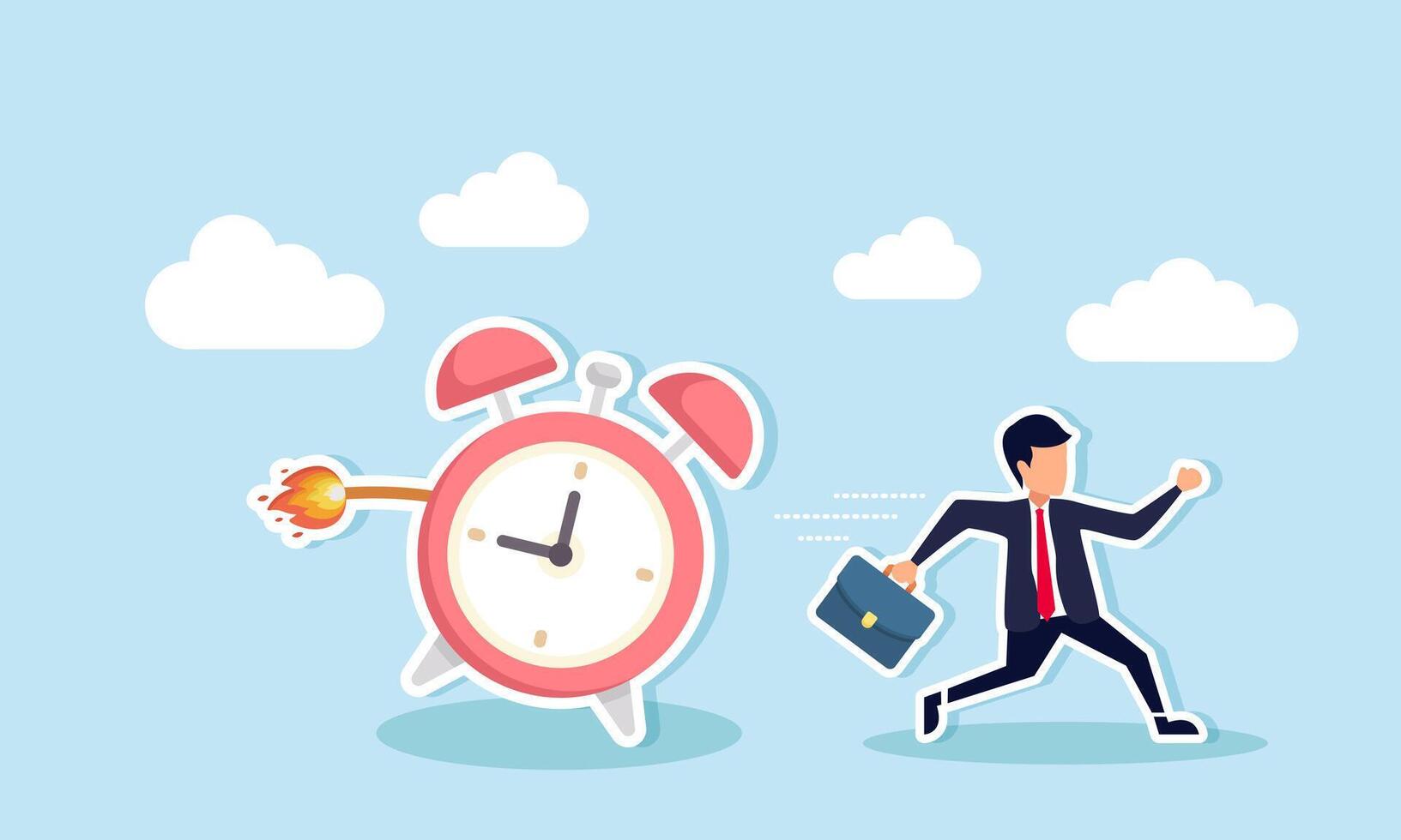 Managing time racing against project deadlines or facing hurdles in product delivery, concept of Afraid businessman fleeing from ticking time bomb ready to explode Pro Vector