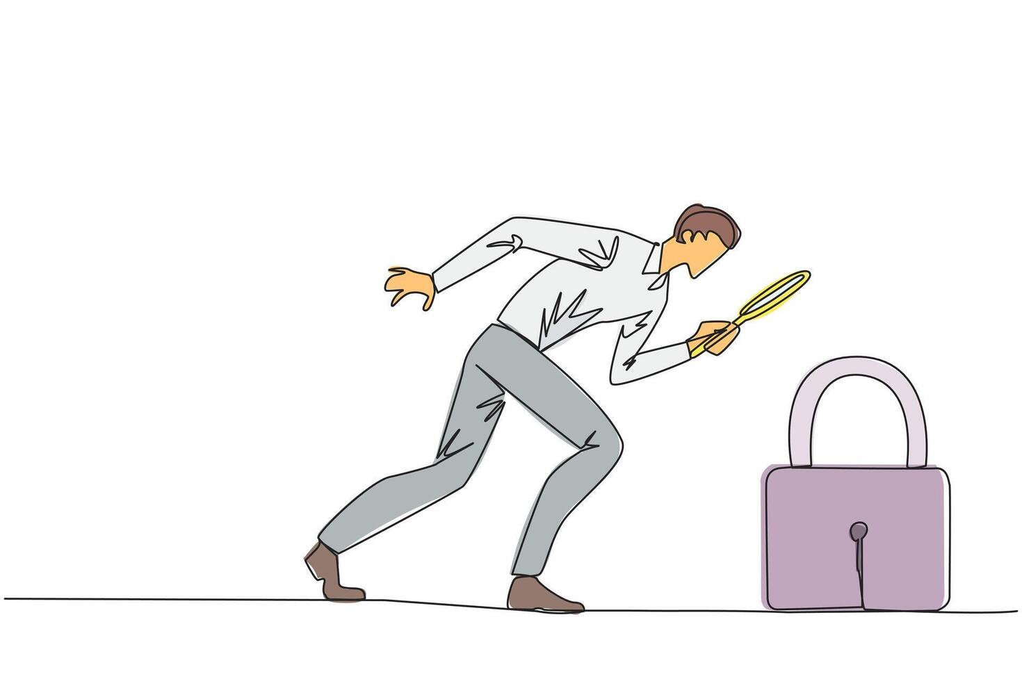 Single one line drawing of businessman holds magnifying glass highlights padlock. Looking ways to protect stock values to keep high and safe from hackers. Continuous line design graphic illustration Pro Vector