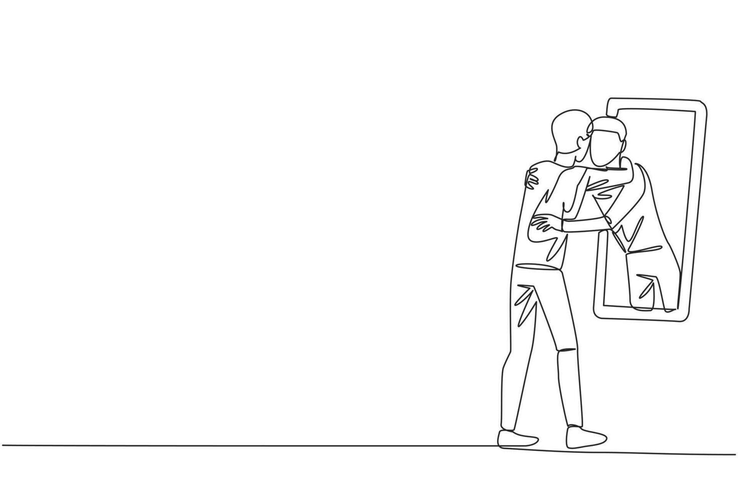 Single continuous line drawing of young happy trendy man stand in front of mirror. His reflection get out of mirror and hug each other. Caring. Self love concept. One line design illustration Pro Vector