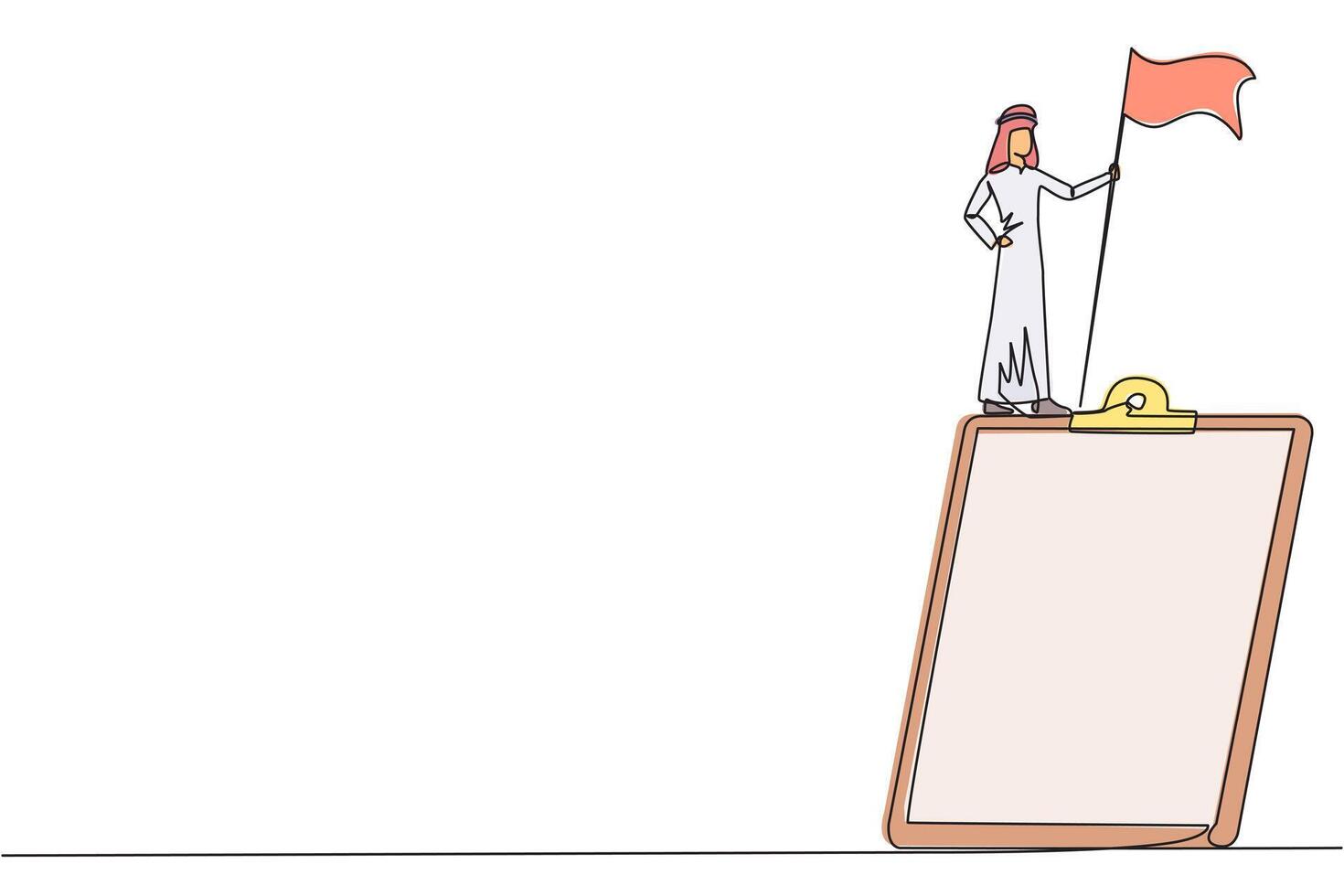 Continuous one line drawing of Arabian businessman standing on giant clipboard holding flag. Create a daily business plan for smooth running of business. Business management concept. Single line draw Pro Vector