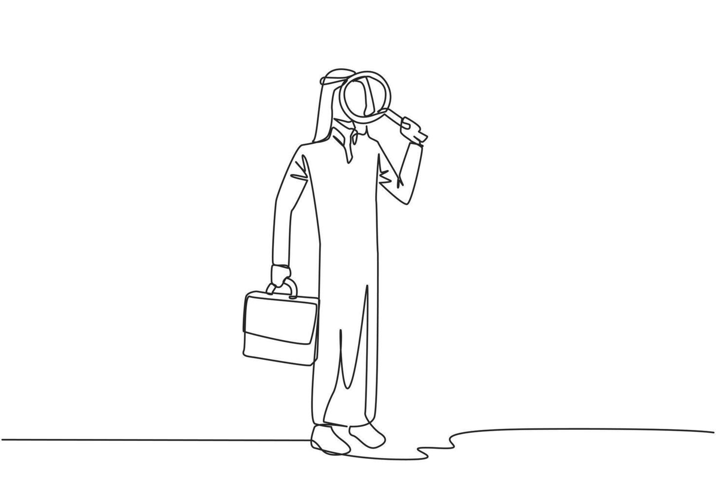 Single continuous line drawing Arab businessman stood holding a magnifier and the other holding a briefcase. Look for smallest possible opportunities for profit that can be exploited. One line Pro Vector