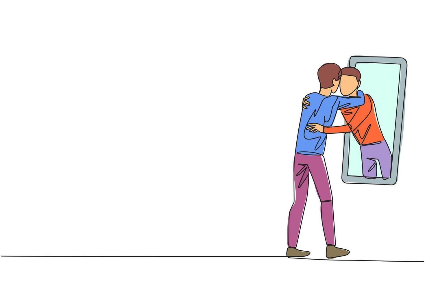 Single continuous line drawing of young happy trendy man stand in front of mirror. His reflection get out of mirror and hug each other. Caring. Self love concept. One line design illustration Pro Vector