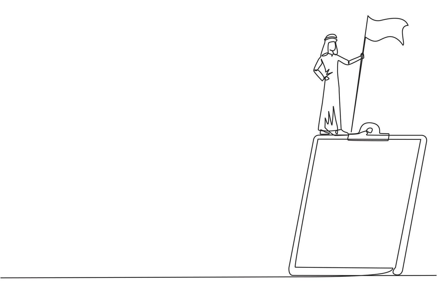 Continuous one line drawing of Arabian businessman standing on giant clipboard holding flag. Create a daily business plan for smooth running of business. Business management concept. Single line draw Pro Vector