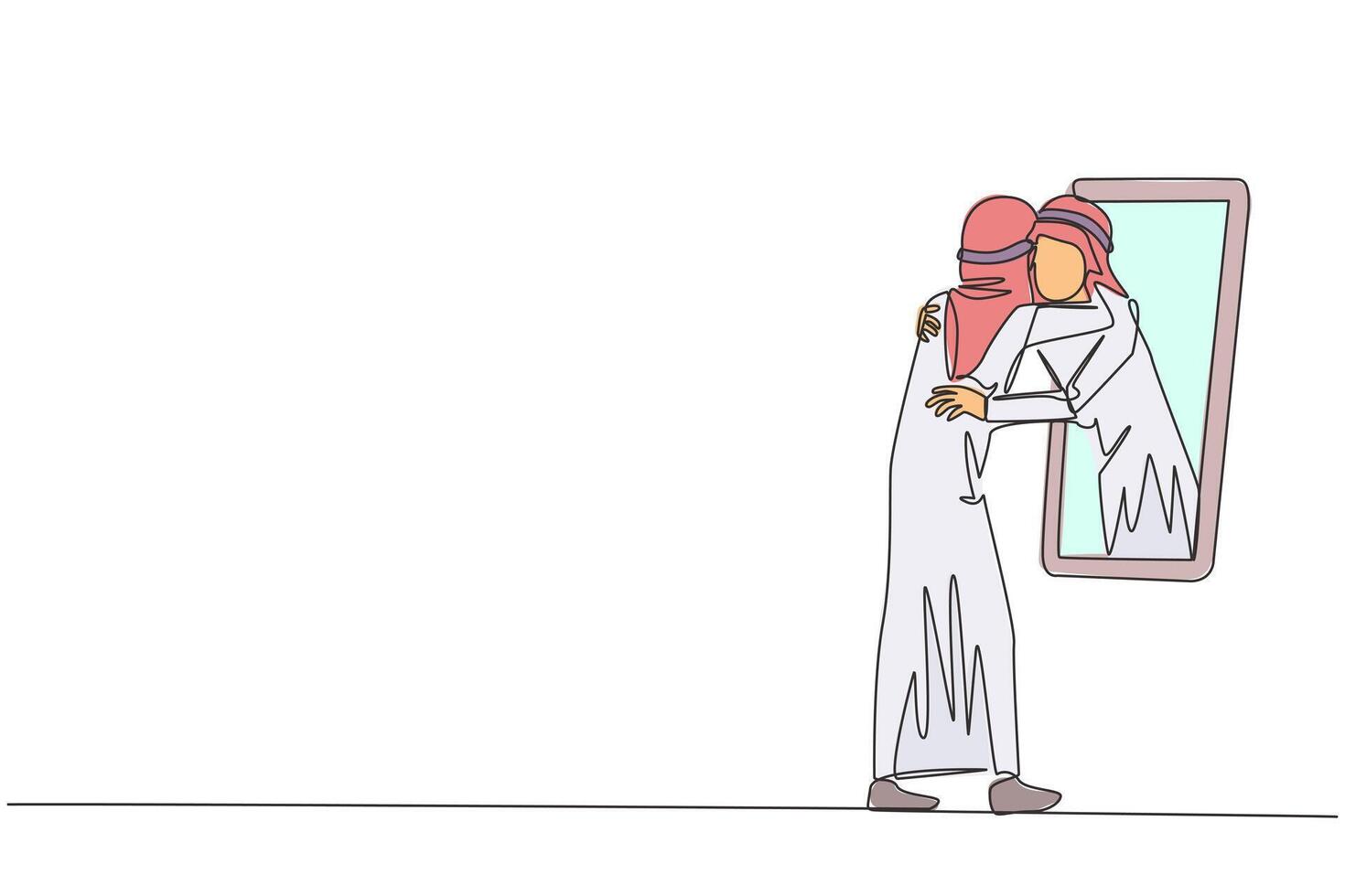 Single one line drawing of young Arabian man stand in front of mirror. His reflection get out of mirror and hug each other. Accepting one body and soul. Continuous line design graphic illustration Pro Vector