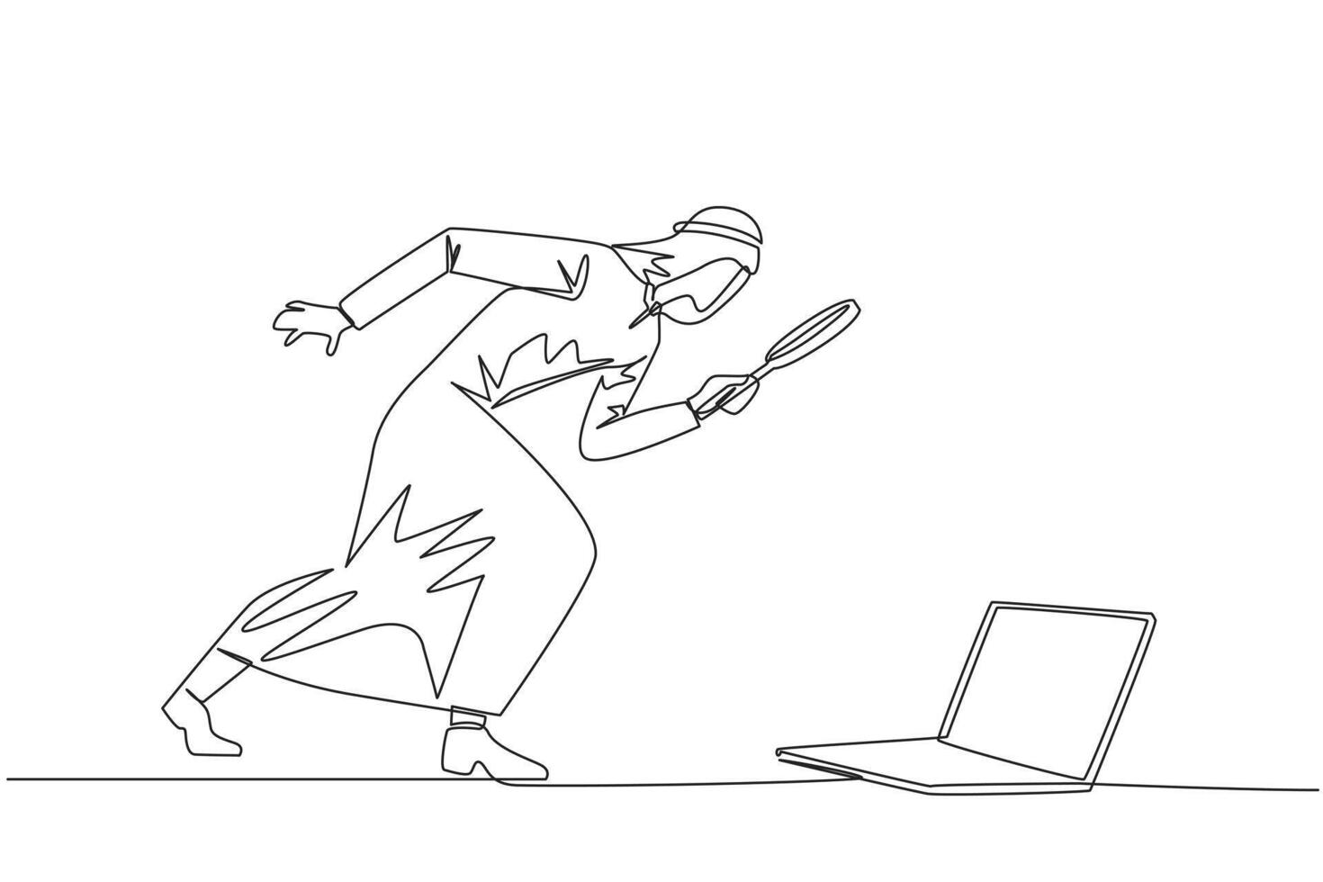 Continuous one line drawing Arabian businessman holding magnifying glass looking at laptop computer. Confused a programmer facing the bugs in the application he made. Single line draw design Pro Vector