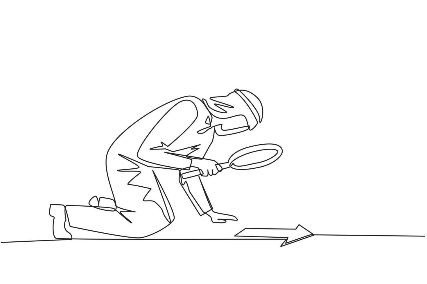 Continuous one line drawing Arabian businessman looked down checking arrows with magnifier. Check direction, it is towards a growing business or makes the business loss. Single line draw design Pro Vector