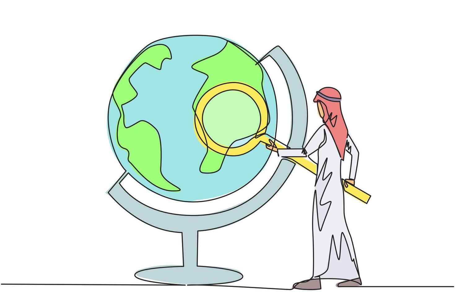 Single continuous line drawing of Arabian businessman stood holding magnifier and inspected the globe. Map out good territory to create and develop new ventures. One line design illustration Pro Vector