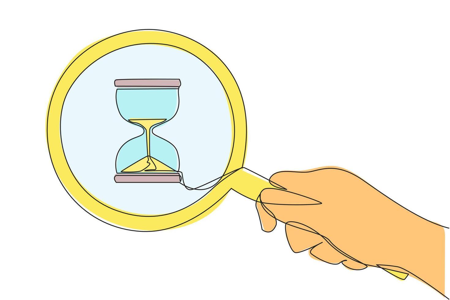 Continuous one line drawing big hand holding magnifying glass highlights the hourglass. Counting down to a new business. Counting days to launch. New goals. Single line draw design illustration Pro Vector