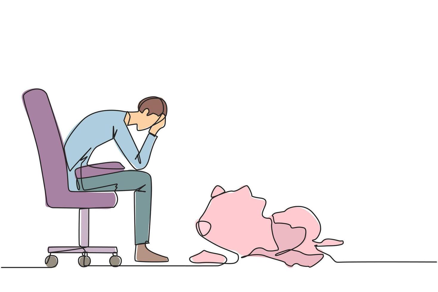 Single continuous line drawing of businessman sits pensively on office chair and in front is a broken piggy bank. Failing to save because have to pay large bills. One line design illustration Pro Vector