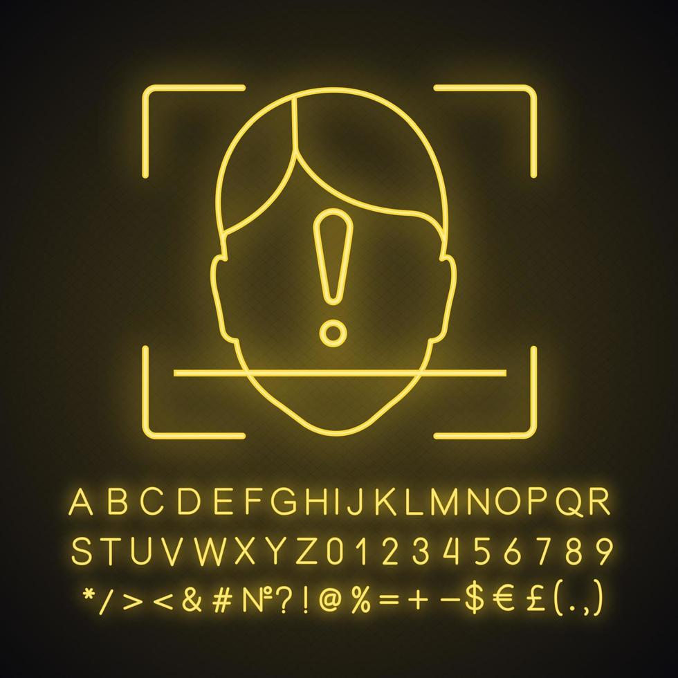 Face ID scan unidentified neon light icon. Facial recognition. Face scan. Permission access rejected. Glowing sign with alphabet, numbers and symbols. Vector isolated illustration Pro Vector