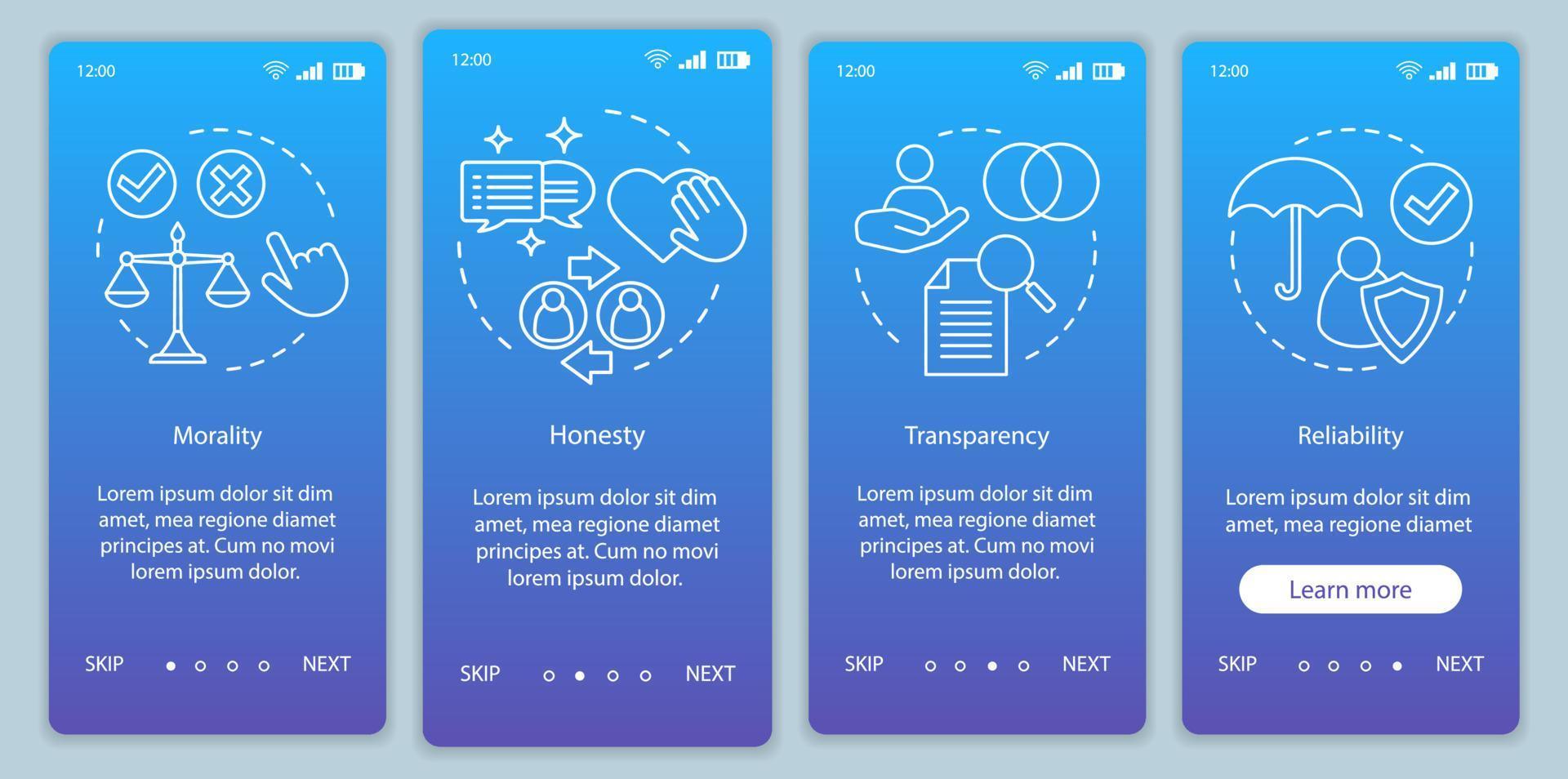 Ethical principles onboarding mobile app page screen vector template. Morality, transparency, reliability. Walkthrough website steps with linear illustrations. UX, UI, GUI smartphone interface concept Pro Vector and Pro SVG
