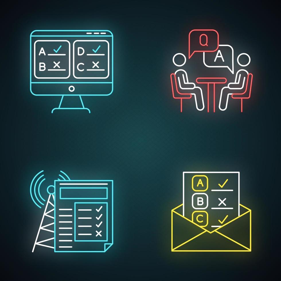 Survey methods neon light icons set. Online, email, internet connection poll. Interview. Public opinion. Customer review. Feedback. Data collection. Glowing signs. Vector isolated illustrations Pro Vector