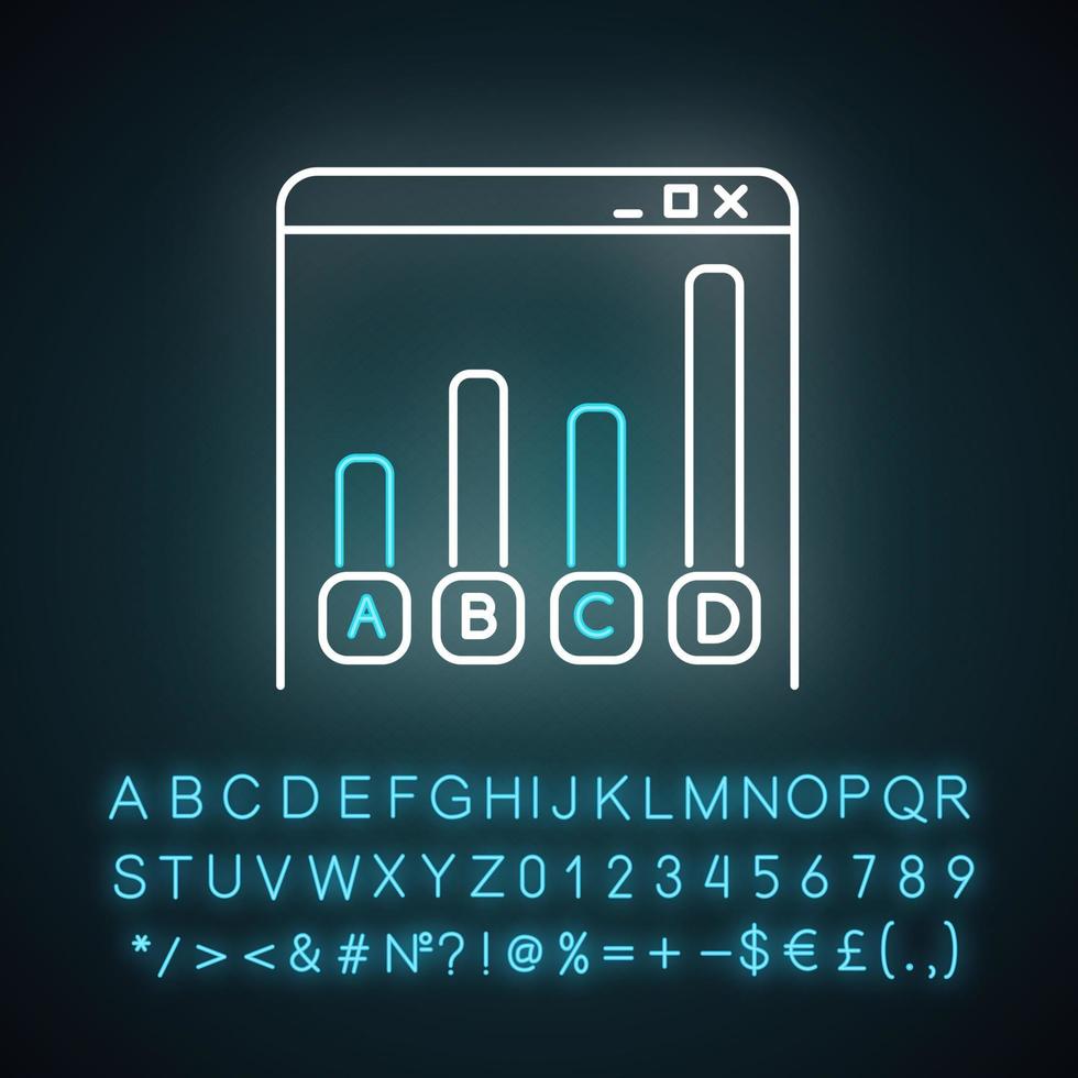Online survey neon light icon. Statistics analysis. Web chart. Internet graph. Info collection. Digital questionnaire. Glowing sign with alphabet, numbers and symbols. Vector isolated illustration Pro Vector