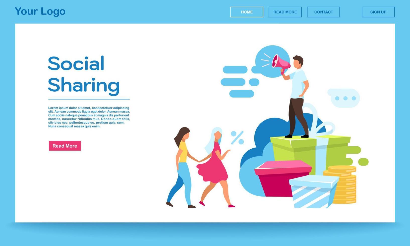 Social sharing landing page vector template. SMM, digital marketing services website interface with flat illustrations. Referral program, rewards. Refer a friend web banner, webpage cartoon layout Pro Vector