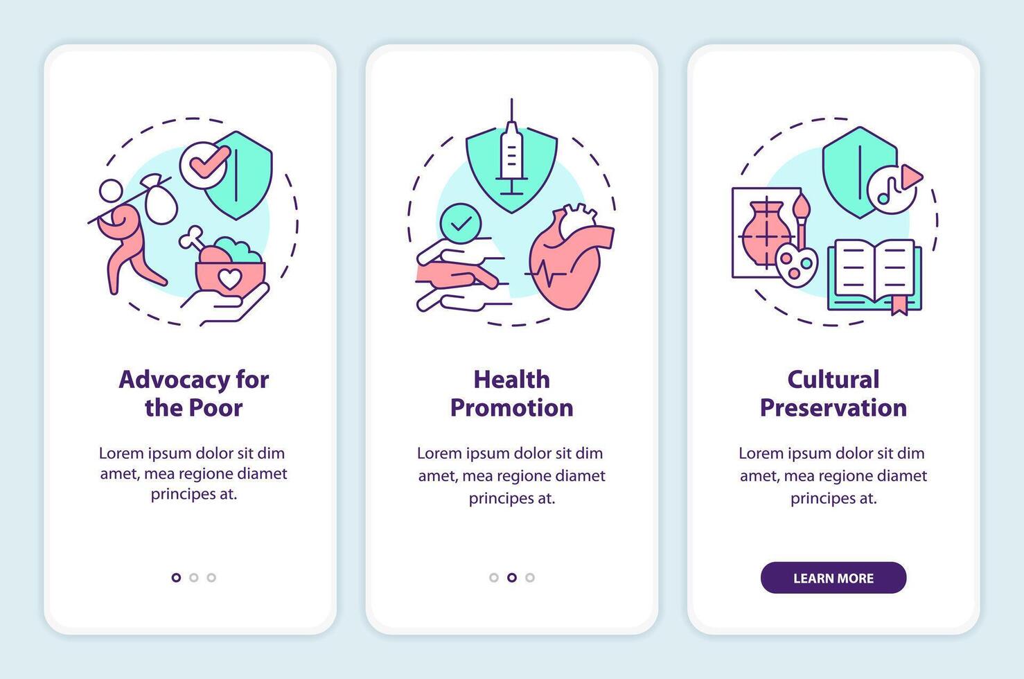 Roles of NGOs onboarding mobile app screen. Human rights walkthrough 3 steps editable graphic instructions with linear concepts. UI, UX, GUI template Pro Vector