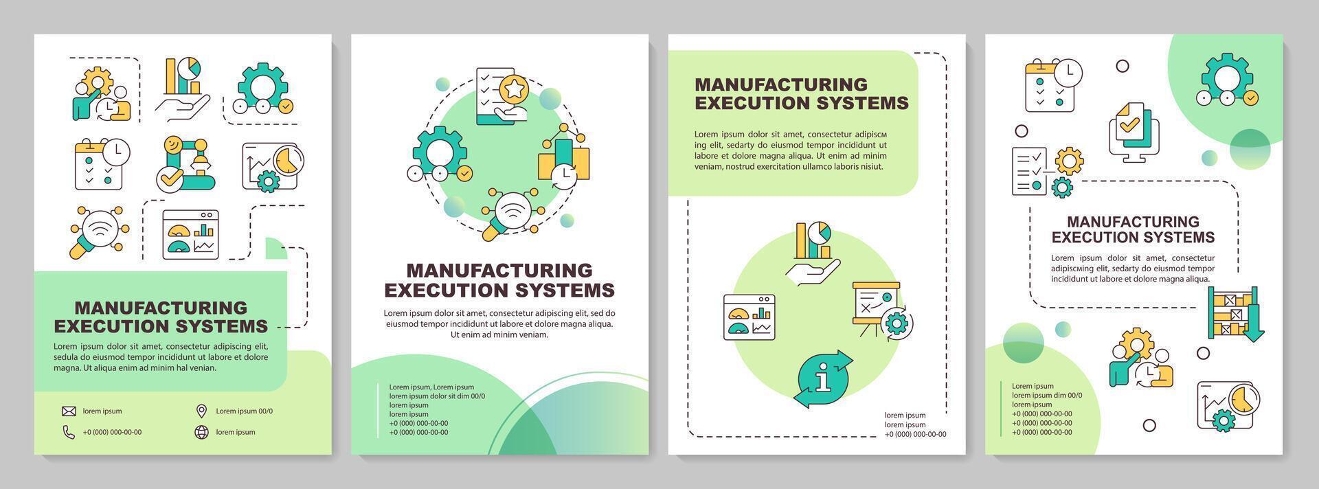 MES systems benefits green circle brochure template. Leaflet design with linear icons. Editable 4 layouts for presentation, annual reports Pro Vector