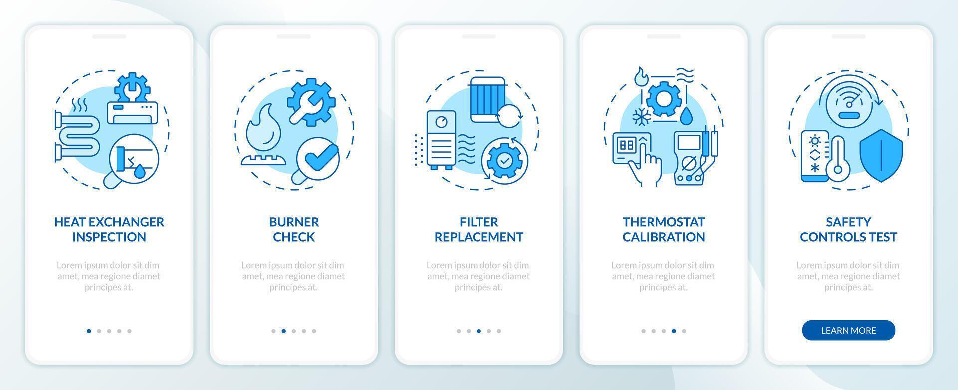 Heating inspection blue onboarding mobile app screen. HVAC walkthrough 5 steps editable graphic instructions with linear concepts. UI, UX, GUI template Pro Vector