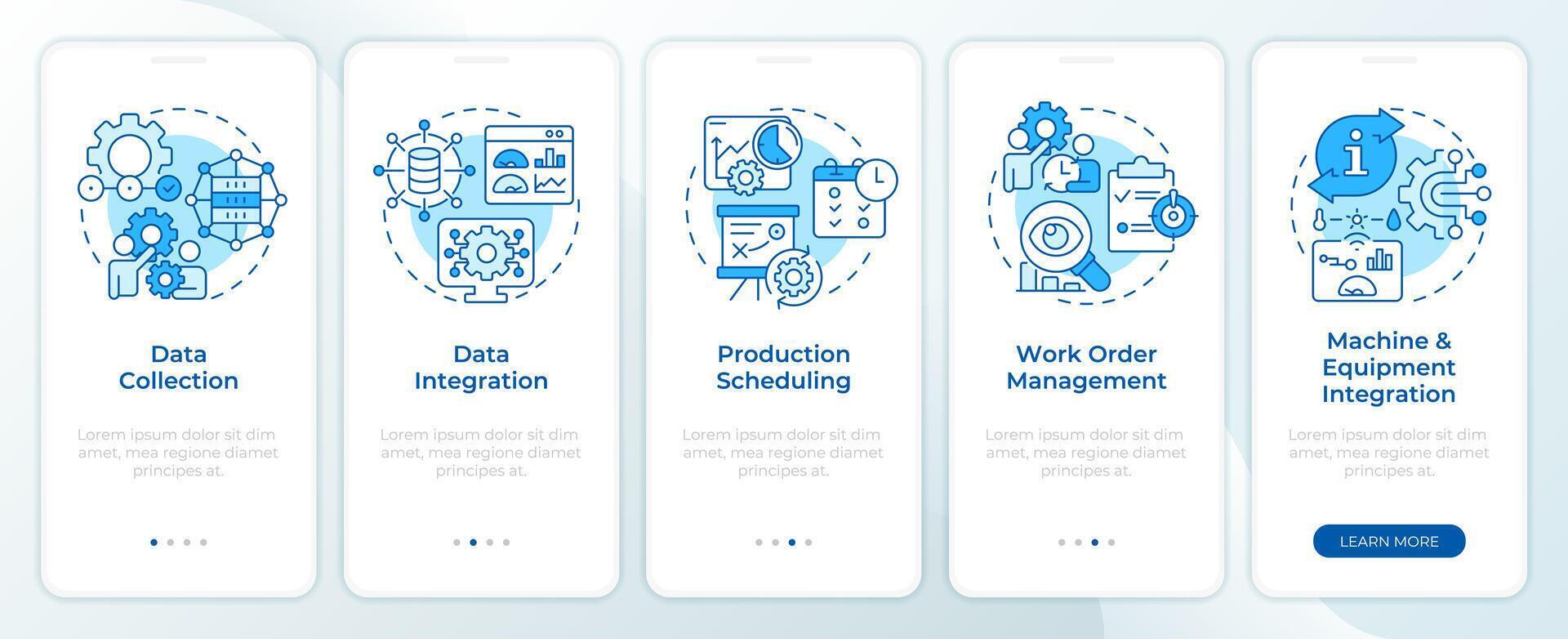 Production optimization blue onboarding mobile app screen. Walkthrough 5 steps editable graphic instructions with linear concepts. UI, UX, GUI template Pro Vector