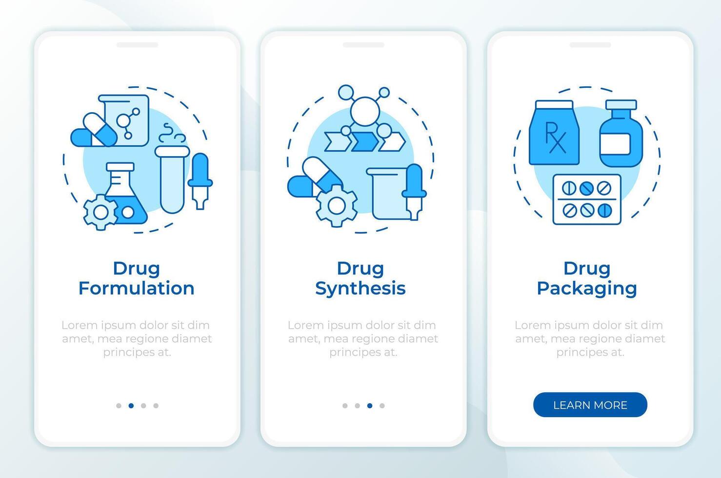 Medical drugs production blue onboarding mobile app screen. Walkthrough 3 steps editable graphic instructions with linear concepts. UI, UX, GUI template Pro Vector
